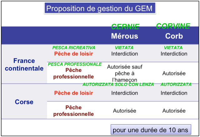 En France, le Conseil Maritime a voté à l’unanimité des dispositions restrictives pour les chasseurs sous marins, qui seront mises en place conjointement par la préfecture Maritime et les préfectures de Régions pour application à partir du 1er janvier 2014. Elles prolongent en durée le moratoire du mérou sur 10 ans et initient un moratoire sur 5 ans du corb.