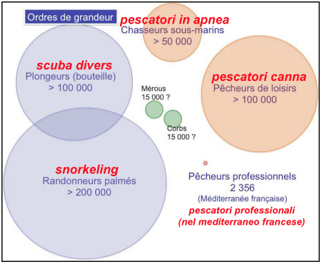 Comme d’habitude la pèche de loisir est la seule objet de discrimination en ces cas car on pense qu’elle ait un impact environnementale majeur. Cette opinion ce fonde sur une considération vraiment simple représentée par la photo 2. Si dans une portion de mer on estime la présence de 15.000 mérous et 15.000 corbs qui vivent avec :