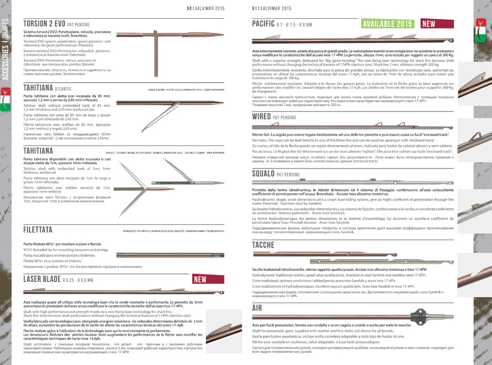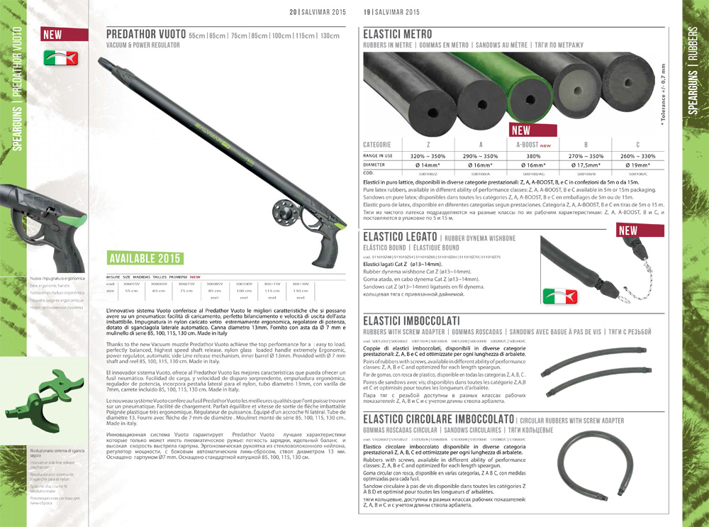 Parmi les plus importantes on trouve certainement les nouvelles flèches LASER et PACIFIQUE, les sandows A-BOOST, la nouvelle combinaison SAPIENS (évolution de la training), mais la place d'honneur va au nouveau fusil pneumatique PREDATHOR. Je ne peux pas anticiper beaucoup de ce fusil révolutionnaire car il sera l’objet d'autres publications spécifiques, je peux seulement dire que c'est un « sous vide » destiné à briser les barrières entre le pneu et les arbalètes en termes de sensibilité, de bruit et de maniabilité.